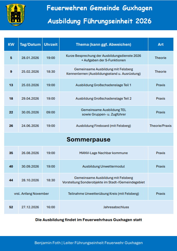 Die Ausbildung findet um 18:30 Uhr im Feuerwehrhaus Guxhagen statt.