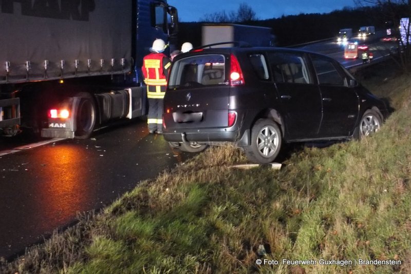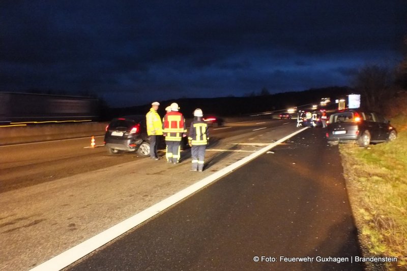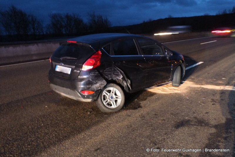 Die Feuerwehr Guxhagen wurde von der Rettungsleitstelle Schwalm- Eder zu einer Hilfeleistung nach Verkehrsunfall auf die A 7 zwischen den Anschlussstellen Guxhagen und Melsungen alarmiert. Die Guxhagener Wehr sicherte die Einsatzstelle ab, leuchtete diese aus und streute ausgelaufene Betriebsmittel ab. Zu dem Unfall kam es, nachdem ein 55 Jahre alter Autofahrer aus Dortmund vom rechten auf den mittleren Fahrstreifen wechseln wollte und dabei den Ford Fiesta der 54-Jährigen streifte. Aufgrund des Zusammenpralls verlor die 54-Jährige die Kontrolle über ihren Wagen, geriet ins Schleudern und prallte in die Mittelleitplanke. Von hier wurde ihr Pkw wieder abgewiesen und kam auf dem mittleren Fahrstreifen zum Stillstand. Der Wagen des Unfallverursachers aus Dortmund landete rechts neben der Fahrbahn. Durch den Aufprall und das Schleudern ihres Wagens zog sich die Autofahrerin vermutlich leichte Verletzungen zu.