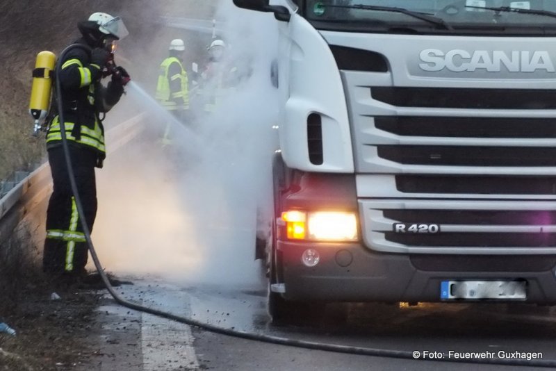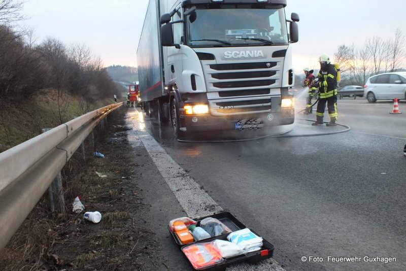 Die Bremsen an einer Zugmaschine mit Sattelauflieger kühlten am späten Samstagnachmittag die Einsatzkräfte der Feuerwehr Guxhagen ab und verhinderten damit vermutlich einen Brand. Der Lkw-Fahrer bemerkte die qualmende Vorderachse und steuerte seinen Lkw auf den Beschleunigungsstreifen der Auffahrt Guxhagen in Richtung Kassel und setzte den Notruf ab. Die Feuerwehr besprühte das Bremssystem mit 2 C-Rohren und stellte den Brandschutz am LKW sicher. Außerdem wurde die Einsatzstelle gegen den fließenden Verkehr abgesichert. Die Temperatur der Bremsanlage wurde mit Hilfe einer Wärmebildkamera kontrolliert.