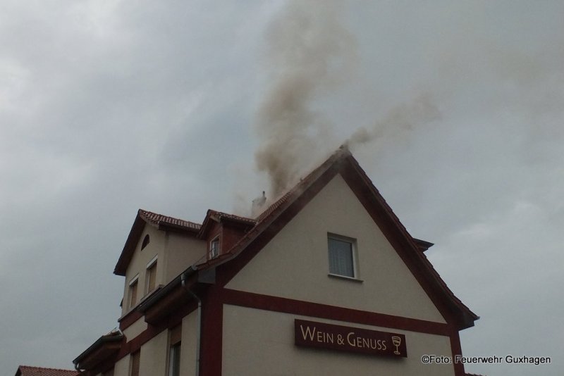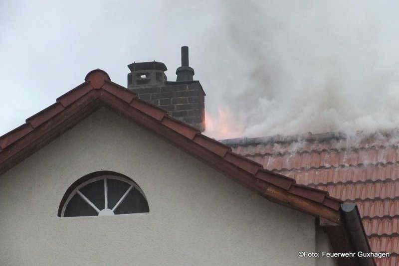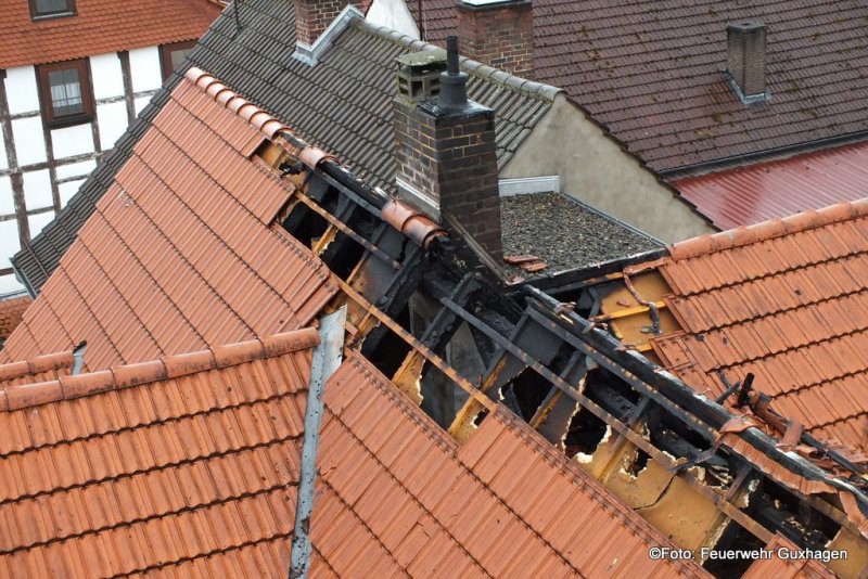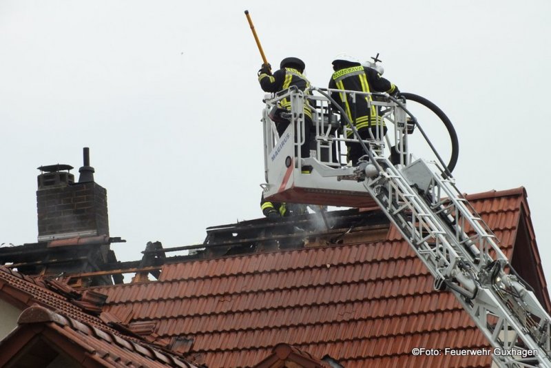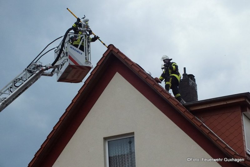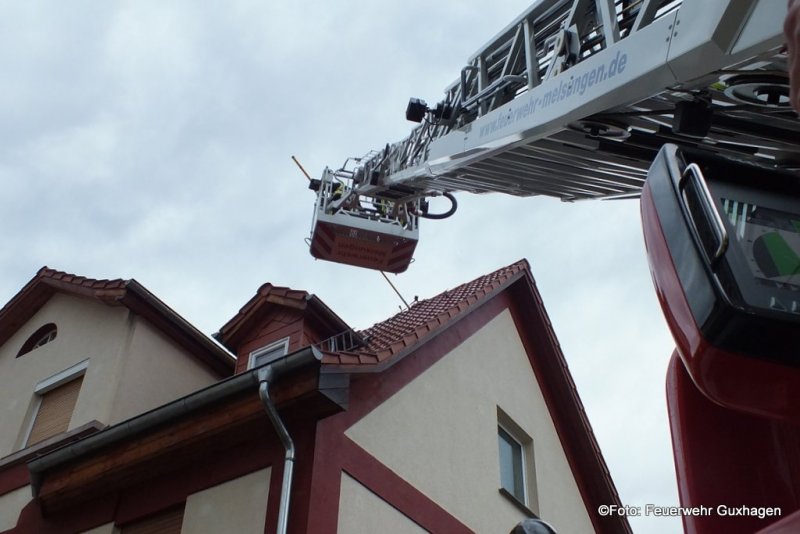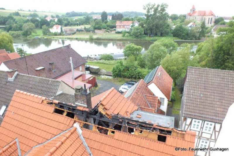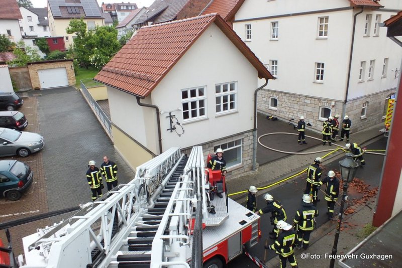Nach einem Gewitter ist am frühen Samstagmorgen der Dachstuhl eines Hauses in der Untergasse in Guxhagen in Brand geraten. Zunächst wurde die Feuerwehr zu einer unklaren Rauchentwicklung alarmiert. Kurz nach dem Eintreffen der Brandschützer schlugen bereits Flammen aus dem Dach des Gebäudes. Zwei C-Rohre, davon ein Trupp unter Pressluftatmern im Innenangriff, waren im Einsatz. Nach dem Ende der Löscharbeiten brachten die Melsunger Feuerwehrleute die Drehleiter in Stellung. Von hier aus wurde die Dachhaut geöffnet und Nachlöscharbeiten durchgeführt. Auch ein Druckbelüfter kam zum Einsatz um das Gebäude rauchfrei zu bekommen. Immer wieder wurde der Dachstuhl mit einer Wärmebildkamera nach Glutnester kontrolliert. Durch das schnelle Eingreifen der Wehren konnte ein Vollbrand des Dachstuhls verhindert werden. Zur Absicherung der Einsatzkräfte befand sich ein Rettungsteam des DRK vor Ort. Verletzt wurde bei dem Brand glücklicherweise niemand. Insgesamt waren drei Trupps unter Atemschutz im Einsatz.