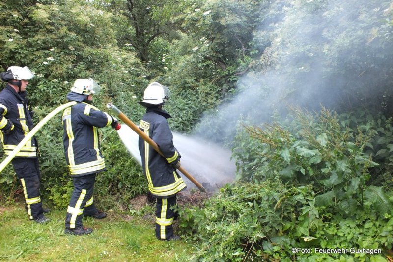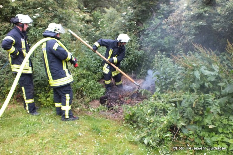 Am Sonntagabend brannte auf einem Grundstück in der Dörnhagener Straße in Guxhagen ein Komposthaufen und ein kleines Stück Böschung. Anwohner hatten die starke Rauchentwicklung der Feuerwehr gemeldet. Ein Trupp konnte den Brand mit Hilfe von Netzmittel im Wasser schnell löschen. Während der Löscharbeiten wurde mit einem Dunghaken der Rasenschnitt auseinandergezogen.