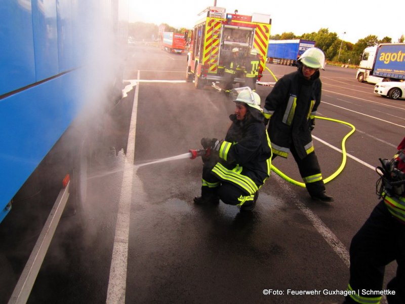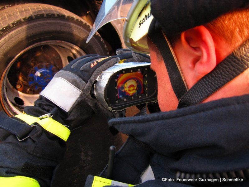 Die Bremsen eines mit Textilstoff beladenen Lkw kühlten am frühen Freitagabend Einsatzkräfte der Feuerwehr Guxhagen ab und verhinderten damit vermutlich einen Brand. Der Ukrainische Lkw-Fahrer wurde von der Polizei, die die qualmende Hinterachse am Lkw auf der Autobahn 7 bemerkten, an der Anschlussstelle Guxhagen rausgezogen. Im Abfahrtsbereich der BAB platzte dann noch ein Reifen am Lastwagen. Die Feuerwehr kühlte mit zwei Rohren die heiß gelaufenen Bremsen ab und kontrollierten mit einer Wärmbildkamera die Temperaturen am Lkw.