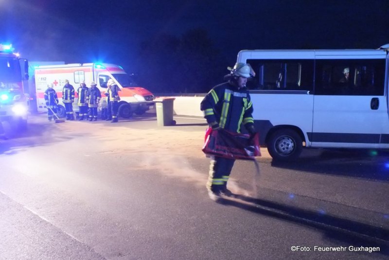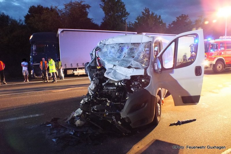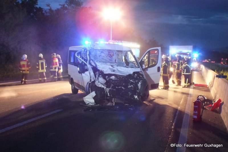 Die Feuerwehr Guxhagen wurde am Dienstagmorgen zu einem schweren Verkehrsunfall mit eingklemmter Person auf die BAB 7 Richtung Kassel alarmiert. Nach Informationen von der Unfallstelle hat ein 50-Jähriger mit seinem Kleinbus auf dem mittleren Fahrstreifen einen Lkw gerammt. Der Kleinbus wurde im Frontbereich stark beschädigt und der Fahrer wurde im Bereich der Füße leicht eingekelmmt. Der Rettungsdienst konnten Mann noch vor dem Eintreffen der Feuerwehr aus dem Peugeot-Kleinbus befreien. Die Feuerwehr sicherte die Unfallstelle, streute ausgelaufene Betriebstoffe ab und reinigte die Fahrbahnen von Trümmerteilen. Der Unfallzug der Berufsfeuerwehr Kassel war ebenfalls zur Unfallstelle alarmiert blieb aber vor Ort in Bereitschaft.