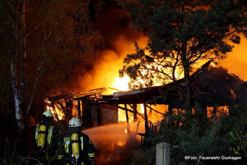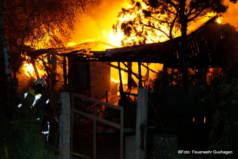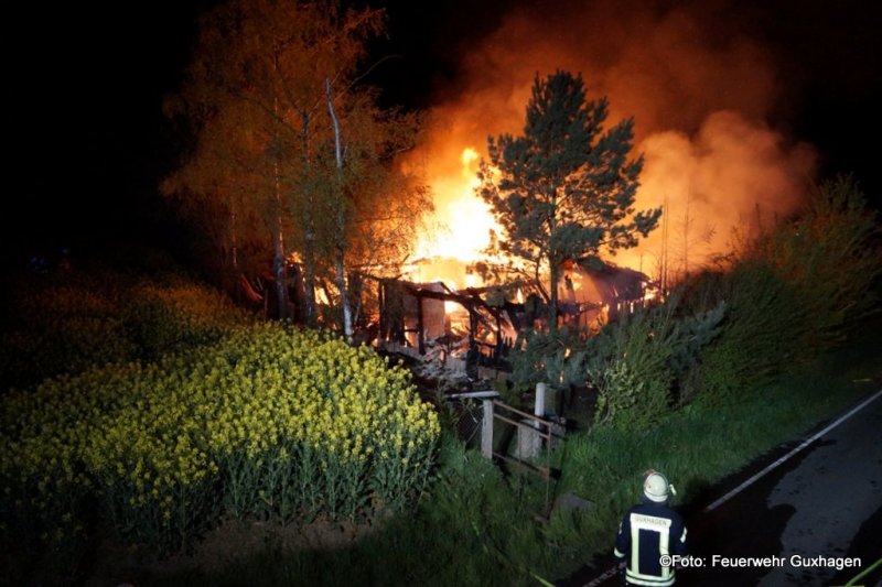 Ein Feuer hat am frühen Samstagmorgen eine Feldscheune zwischen Guxhagen und Albshausen völlig zerstört. Bereits bei Eintreffen der ersten Einsatzkräfte stand das Gebäude in Vollbrand. Kurz nach 01:00 Uhr wurde der Brand durch eine Zeugin gemeldet. Mehrere Trupps unter Pressluftatmern versuchten das Feuer im Außenangriff unter Kontrolle zu bekommen. Eine Wasserversorgung wurde über eine Länge von 300 Metern aufgebaut. In der ca. 100 Quadratmeter großen Feldscheune waren landwirtschaftliche Geräte, Maschinen, Gerümpel und ein Anhänger untergestellt. Um das immer wieder Auflodern der Flammen wirksam zu verhindern, setzten die Brandschützer Löschschaum ein um den Brand zu ersticken. Mit der Hilfe eines Baggers vom gemeindlichen Bauhof wurde der Brandschutt auseinandergezogen und dann nochmals abgelöscht. Eine Wärmebildkamera kam auch zum Einsatz. Dennoch konnte die Feldscheune durch die bereits große Ausdehnung des Feuers nicht mehr gerettet werden und brannte bis auf die Grundmauern nieder.