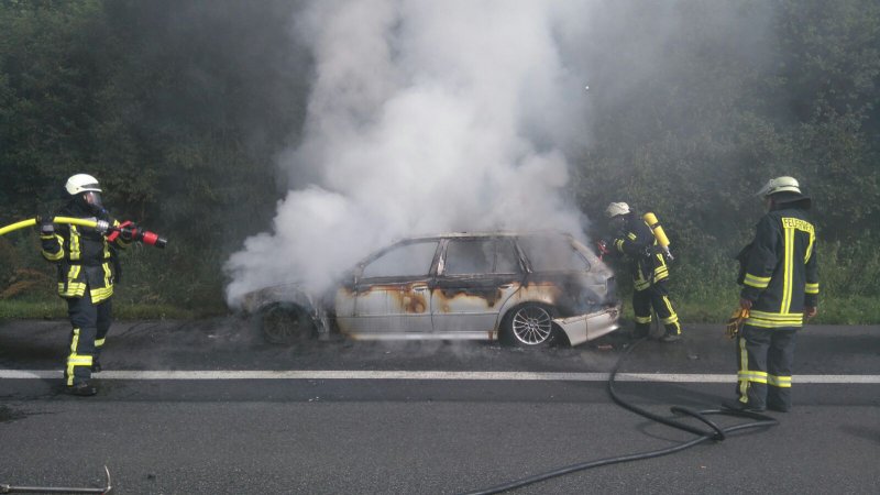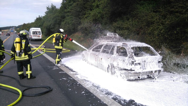 Auf der Autobahn 7 zwischen Guxhagen und dem Kiliansblick in Fahrtrichtung Kassel, kurz vor einer Baustelleneinfahrt, ist am späten Donnerstagnachmittag ein alter BMW 5er Touring abgebrannt. Der Fahrer konnte seinen Wagen rechtzeitig auf dem Standstreifen stoppen und den Pferdeanhänger abkoppeln. Als die Guxhagener Wehr eintraf, brannte der BMW bereits lichterloh. Ein Trupp unter Atemschutz ging mit dem Schnellangriff vor, ein weiterer Trupp löschte mit einem C-Schlauch. Um auch die letzten Glutnester zu entfernen, setzten die Kameraden noch Schaum ein.