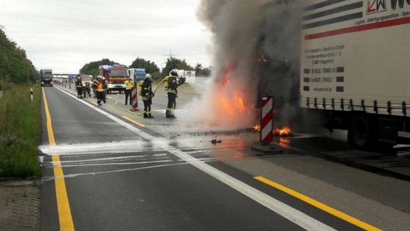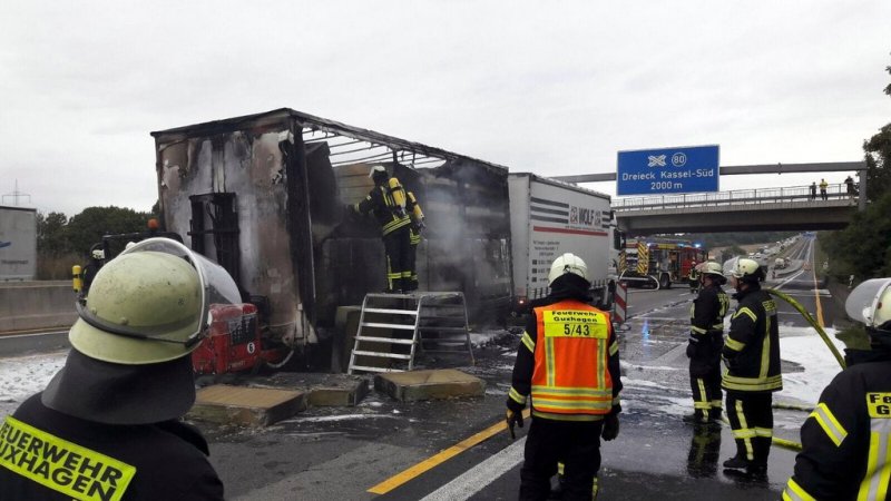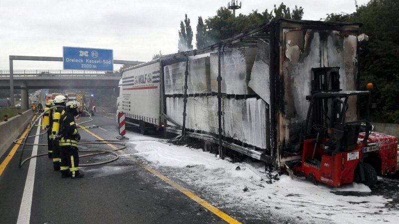 Am Montag ist ein mit Dämmplatten beladener Lkw-Anhänger im Baustellenbereich auf der Autobahn 7 zwischen Guxhagen und Kassel in Brand geraten. Nach einem technischen Defekt am Anhänger, vermutlich heißgelaufene Bremsen, griff das Feuer vom Unterbau rasch auf die Ladung über. Trotz des schnellen Eingreifens der Wehr, die mit mehreren Rohren das Feuer bekämpfte, konnte das Ausbrennen des Hängers nicht verhindert werden. Der Fahrer erlitt einen Schock und musste vom Rettungsdienst in ein Krankenhaus gebracht werden. Die Berufsfeuerwehr Kassel versorgte die Kameraden aus Guxhagen mit genügend Löschwasser.