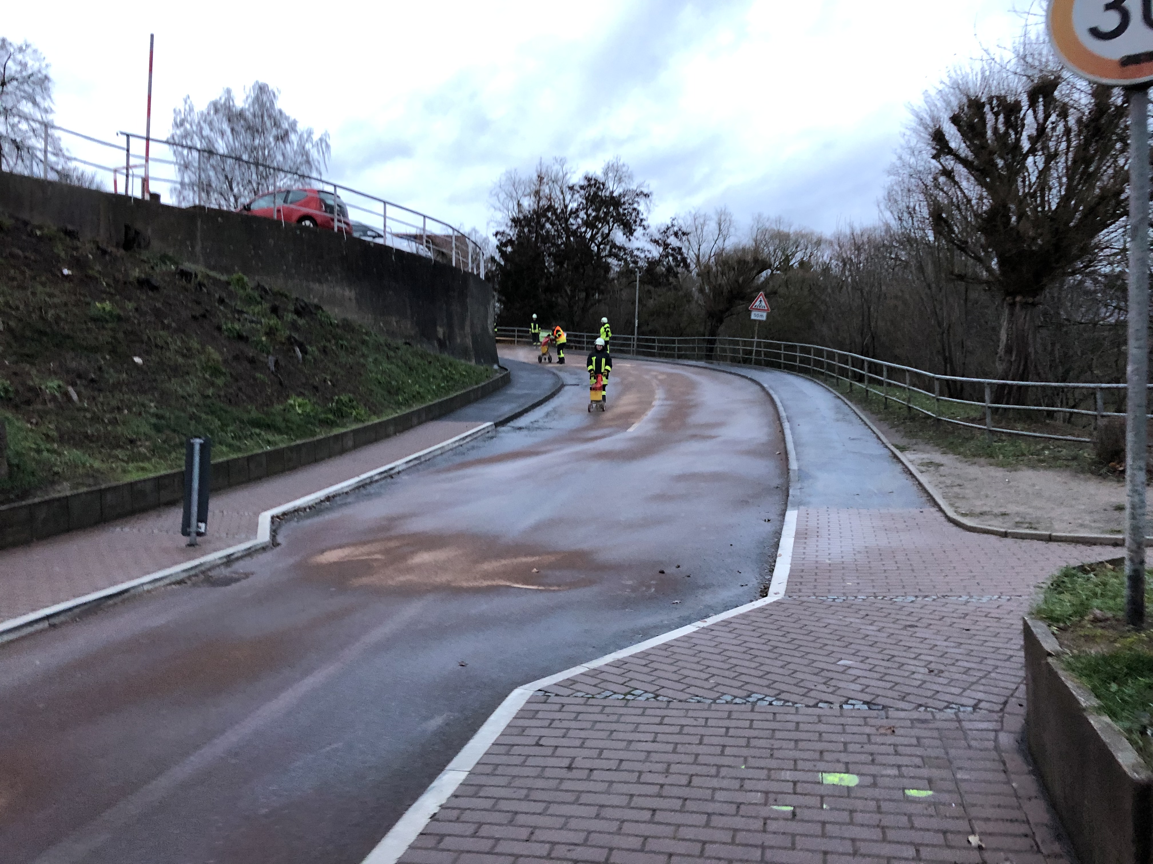 Schon auf der Anfahrt zum Gerätehaus war klar das es sich hierbei um eine größere Treibstoffspur handelte und die Straße dadurch sehr rutschig war.