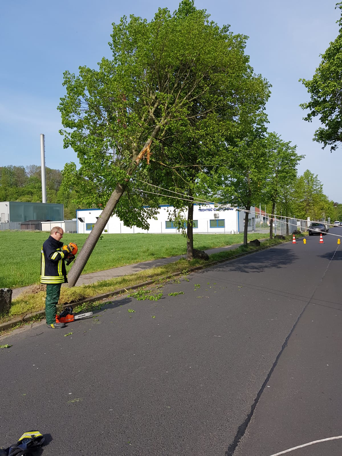 Da der Baum drohte auf die Straße zu fallen, sperrte die Feuerwehr die Straße und sicherte den Baum mit einer Leine um ihn anschließend kontrolliert zum fallen zu bringen.