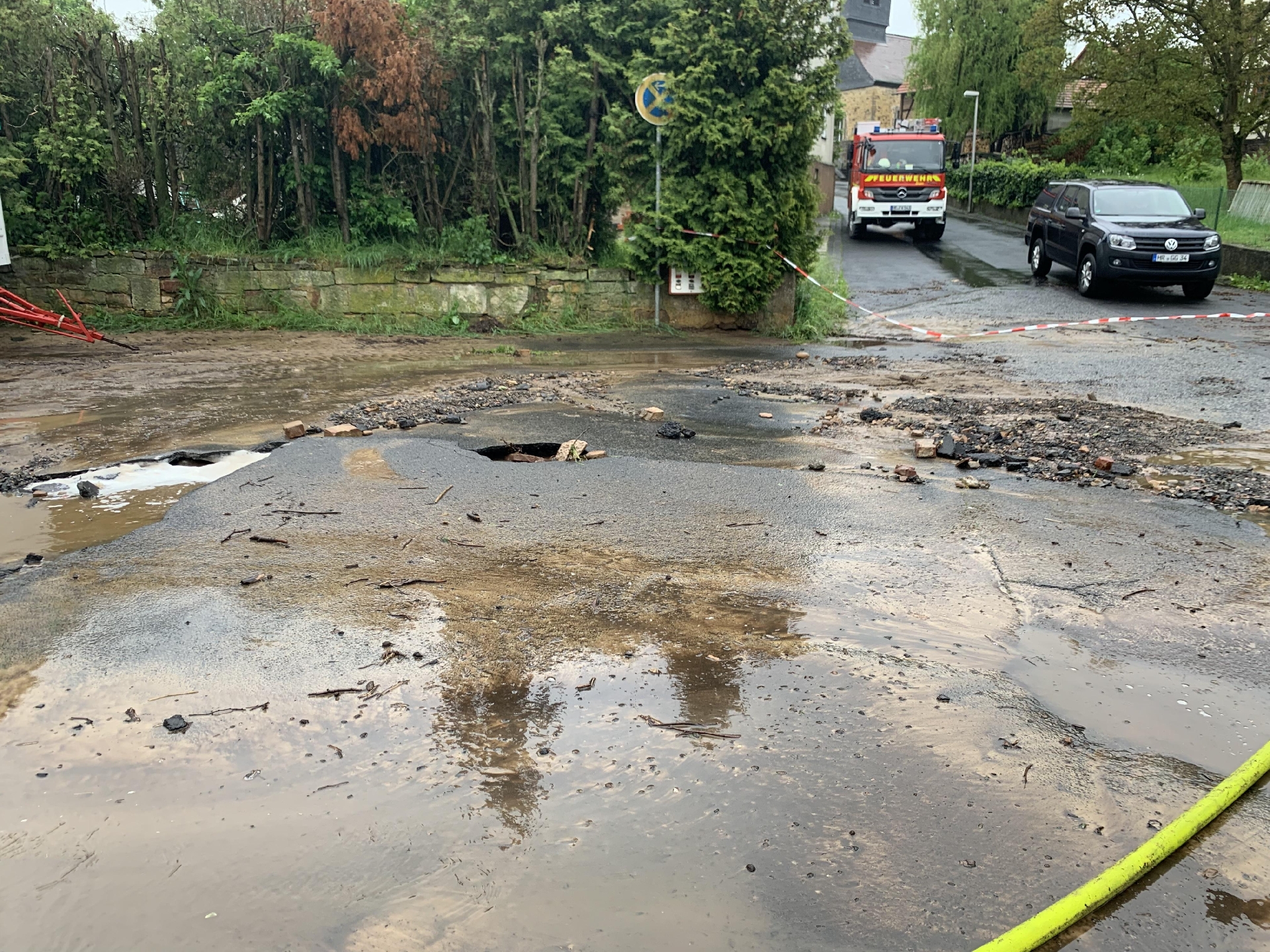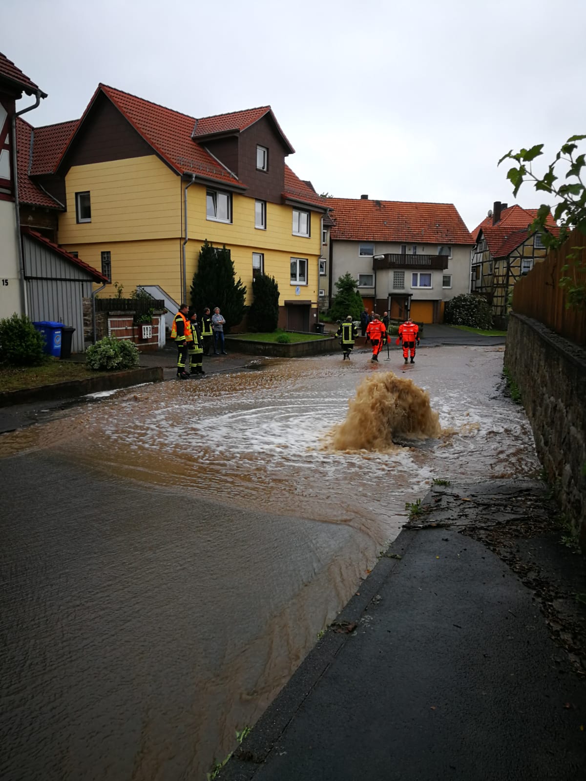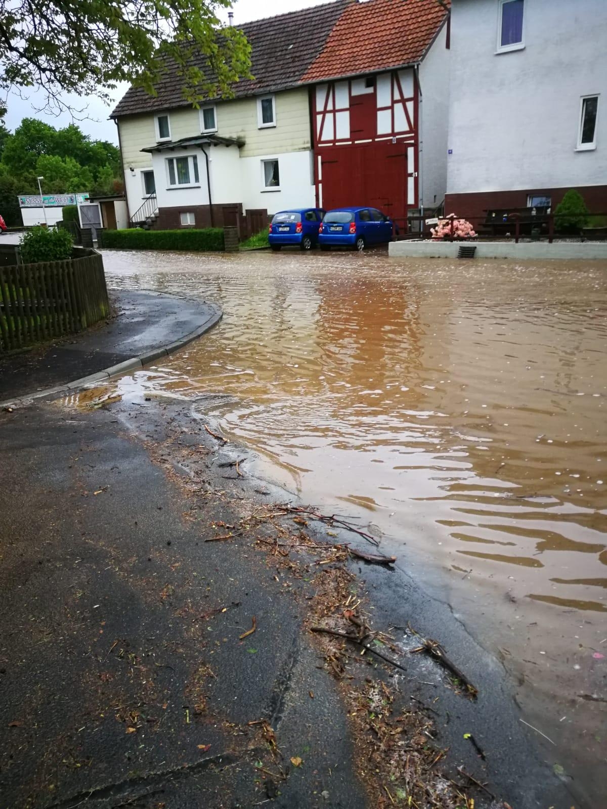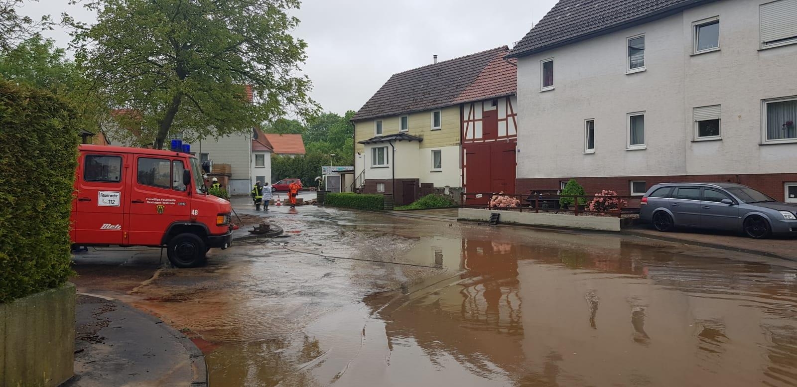 Beim Eintreffen war die komplette Bachstraße überflutet. Aus den Kanalöffnungen strömte das Wasser in etwa 1 Meter hohen Wasserfontänen. Von der L3460 lief das Wasser ebenfalls ins Dorf. Die erste Maßnahme für die Guxhagener Wehr war es die Kanaleinläufe zwischen Ortseingang und Sportplatz freizumachen, damit das Wasser von der L3460 ablaufen kann.