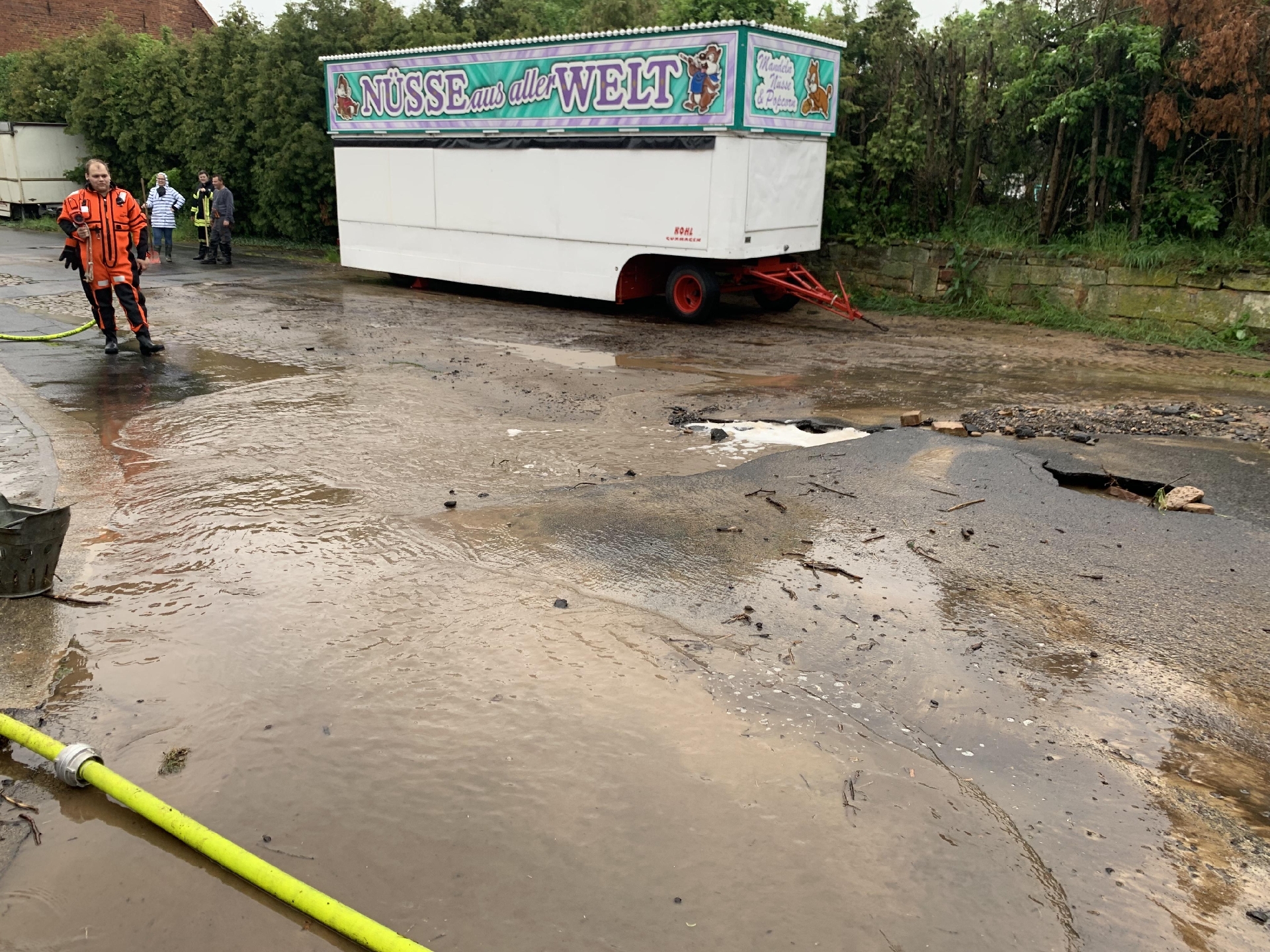 Nachdem das Wasser weitestgehend abgelaufen war, unterstützte die Feuerwehr den Bauhof dabei die Straße vom Schlamm zu befreien.