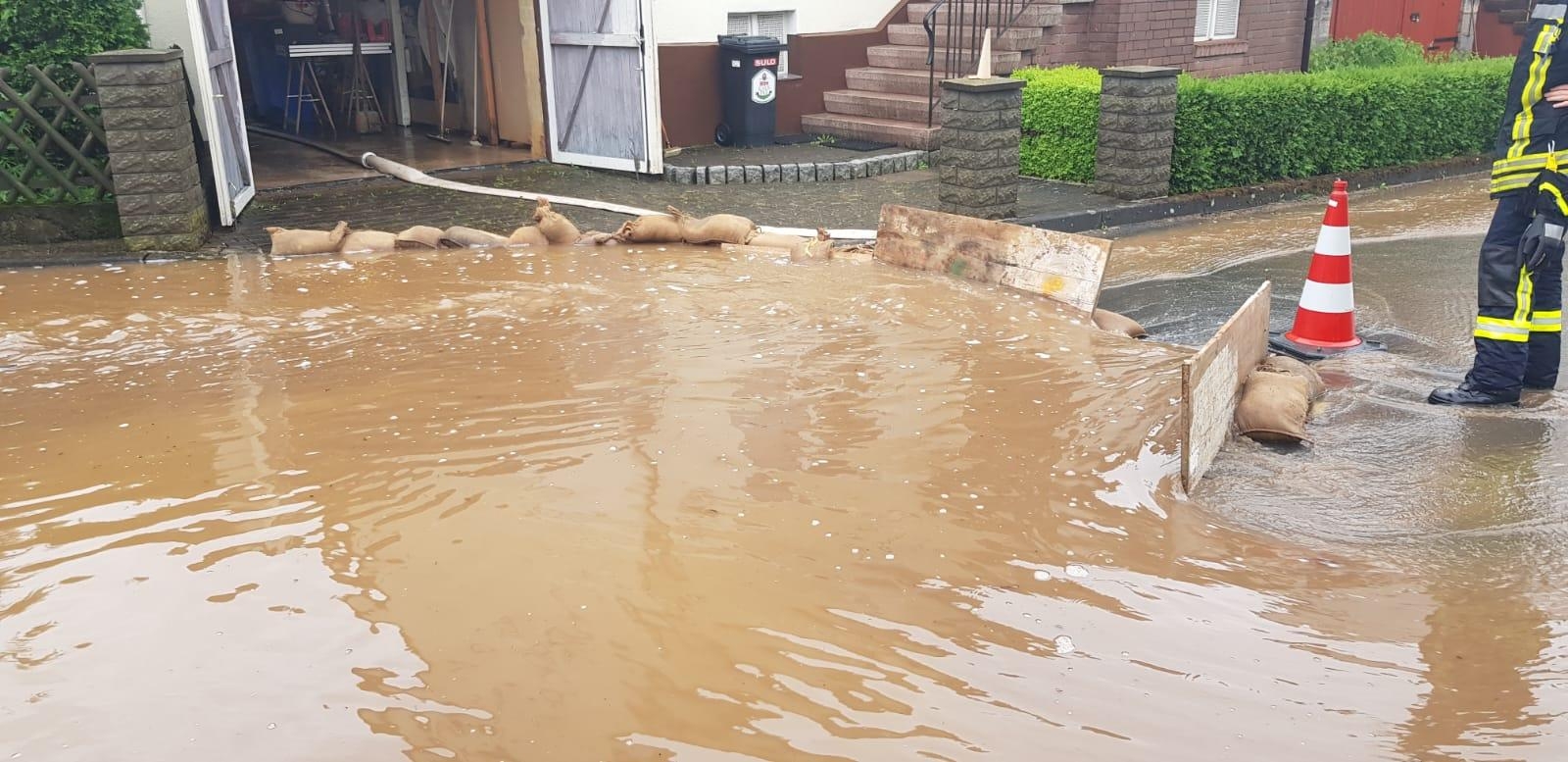 Anschließend ging es für alle Einsatzkräfte in die Bachstraße, wo ebenfalls erst probiert wurde alle Kanalabläufe freizumachen, parallel dazu fing die Feuerwehr und der Bauhof an Sandsäcke zufüllen, um den Objektschutz sicherzustellen. In einen Keller war bereits Wasser eingedrungen, dort wurde eine Tauchpumpe und ein Wassersauger in Stellung gebracht um den Keller Wasserfrei zu bekommen. Ein zweiter Keller wurde dank der Schutzmaßnahmen geschützt.