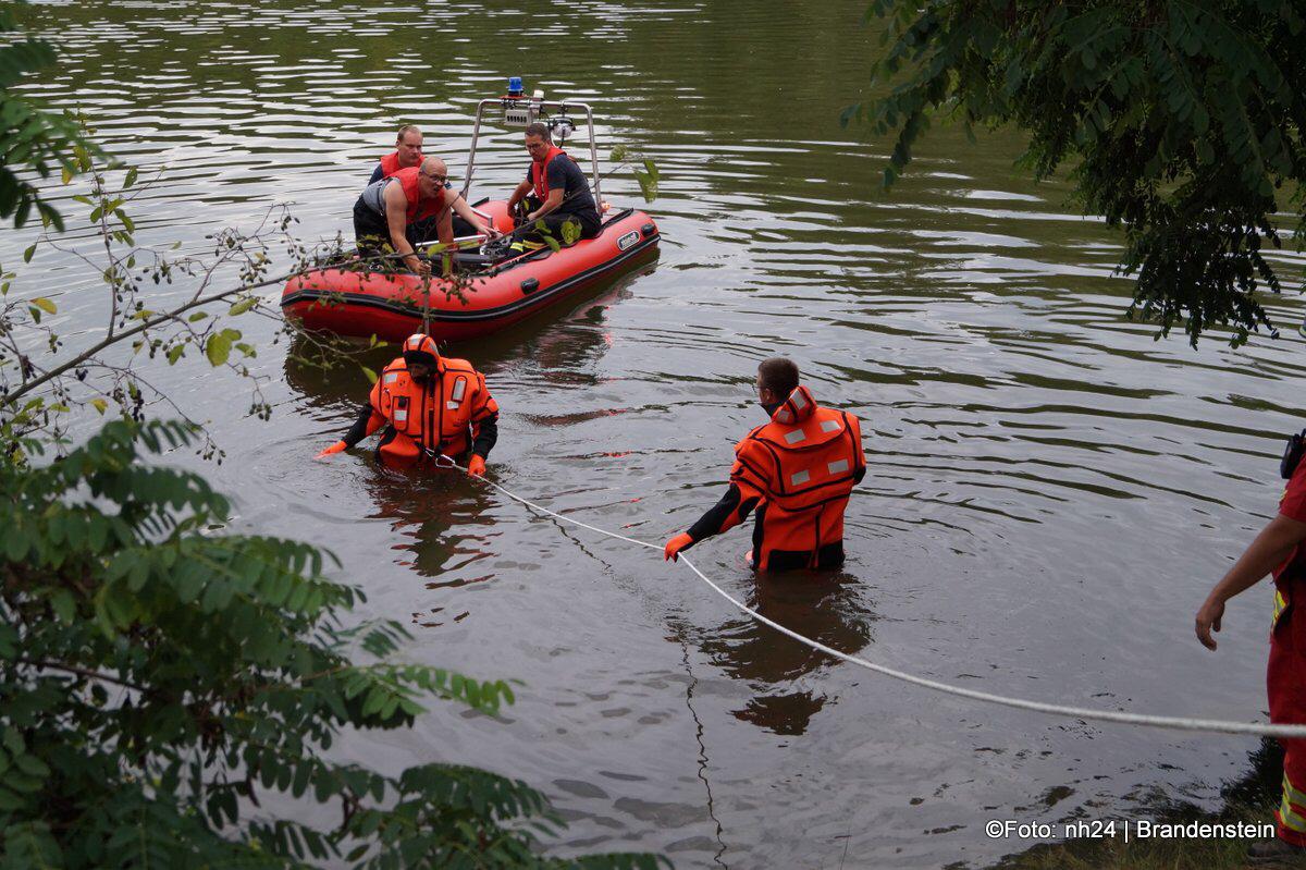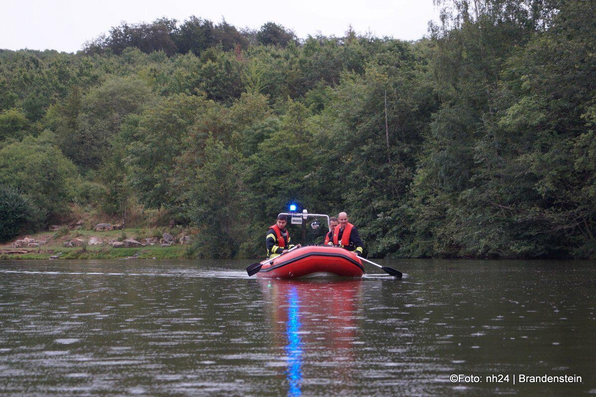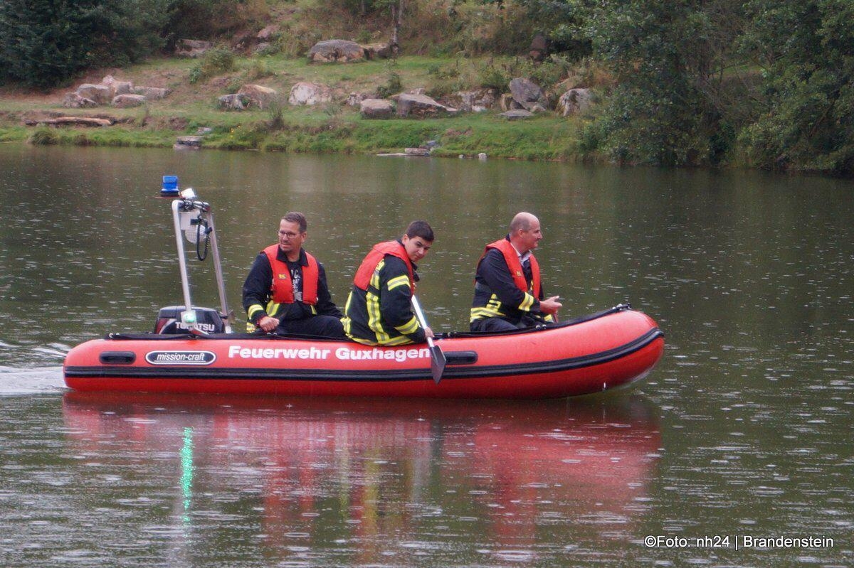 Die Guxhagener Einsatzkräfte erkundeten die Lage und ließen umgehend das Rettungsboot zu Wasser, zusätzlich rüstete sich ein Trupp mit Überlebensanzügen aus um die Uferbereiche abzusuchen.
