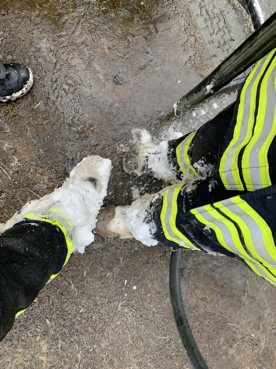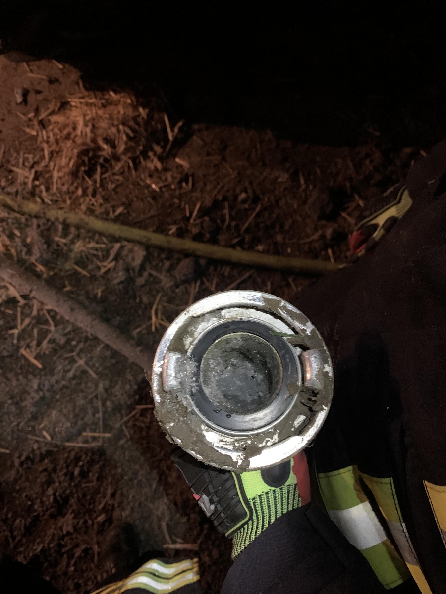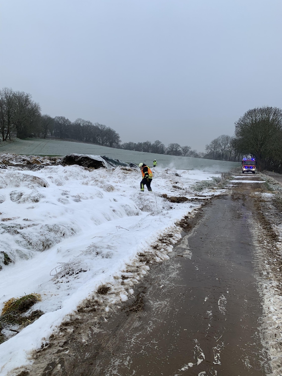 Der Haufen der aus Stroh, Heu und Futterweizen bestand wurde erneut mit schweren Gerät auseinander gezogen und abgelöscht. Anschließend wurde noch eine Schaumdecke über das Brandgut gelegt um ein wiederaufflammen zu vermeiden.